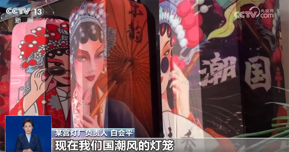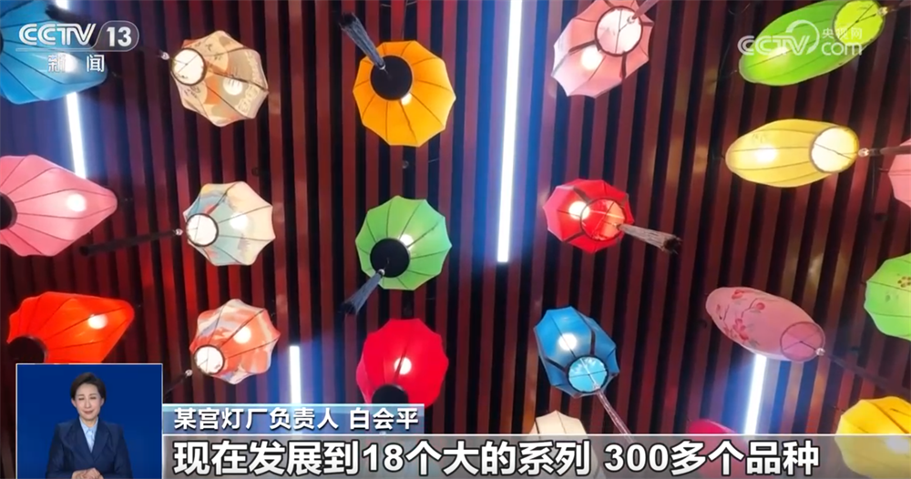 某宮燈廠負責人 白會平:通過跟大專院校合作,研發(fā)新的產(chǎn)品,每年都得有一個新的突破?,F(xiàn)在我們國潮風的燈籠特別受年輕消費群體的喜歡。原來我們是單一的幾個品種,現(xiàn)在發(fā)展到18個大的系列、300多個品種,而且根據(jù)客戶的要求還可以量身定做。