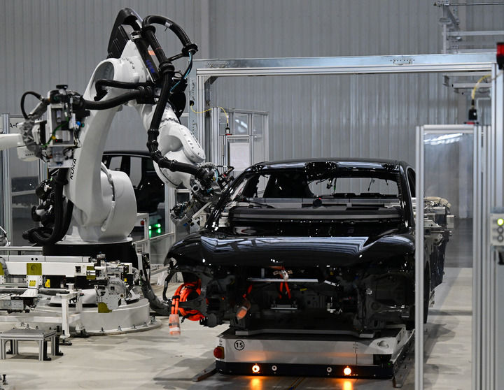 2025年7月1日在合肥市新橋智能電動(dòng)汽車產(chǎn)業(yè)園蔚來第二工廠拍攝的新能源汽車生產(chǎn)線。新華社記者 周牧 攝