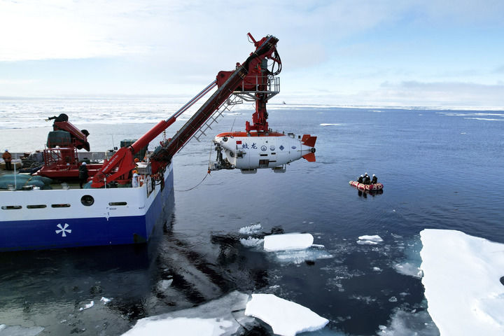 2025年8月11日,“蛟龍”號(hào)在北極冰區(qū)準(zhǔn)備下潛。新華社記者 劉詩平 攝