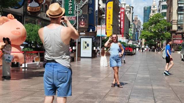 題圖來源:2025年夏天,外國(guó)游客在南京路步行街上留影。
