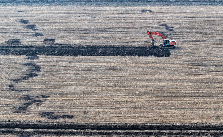 2025年3月11日,在天津市津南區(qū)八里臺鎮(zhèn)大韓莊村,工人駕駛挖掘機進行高標準農(nóng)田施工作業(yè)(無人機照片)。