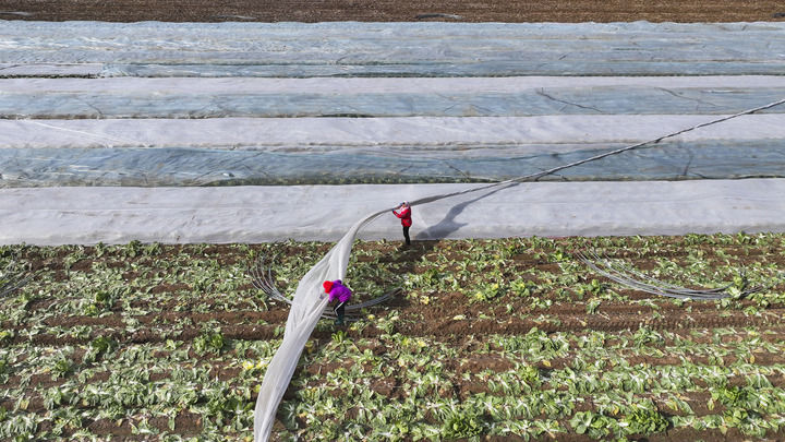 2025年12月11日,在山東省東營市廣饒縣李鵲鎮(zhèn),農(nóng)民為作物覆蓋防寒無紡布,應對寒潮(無人機照片)。