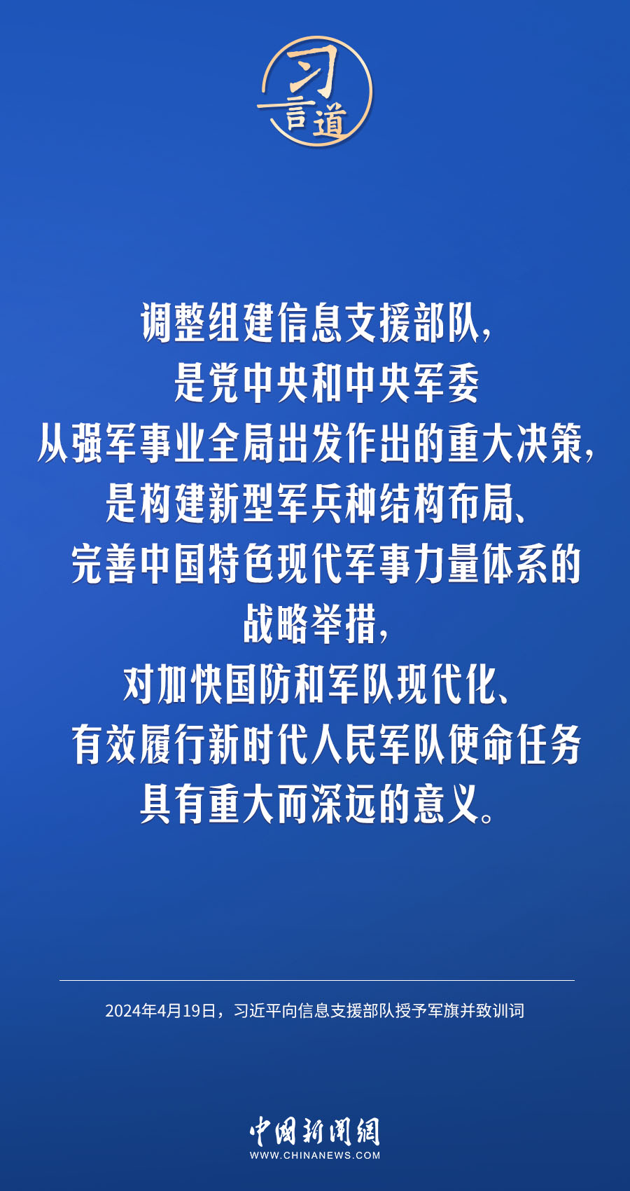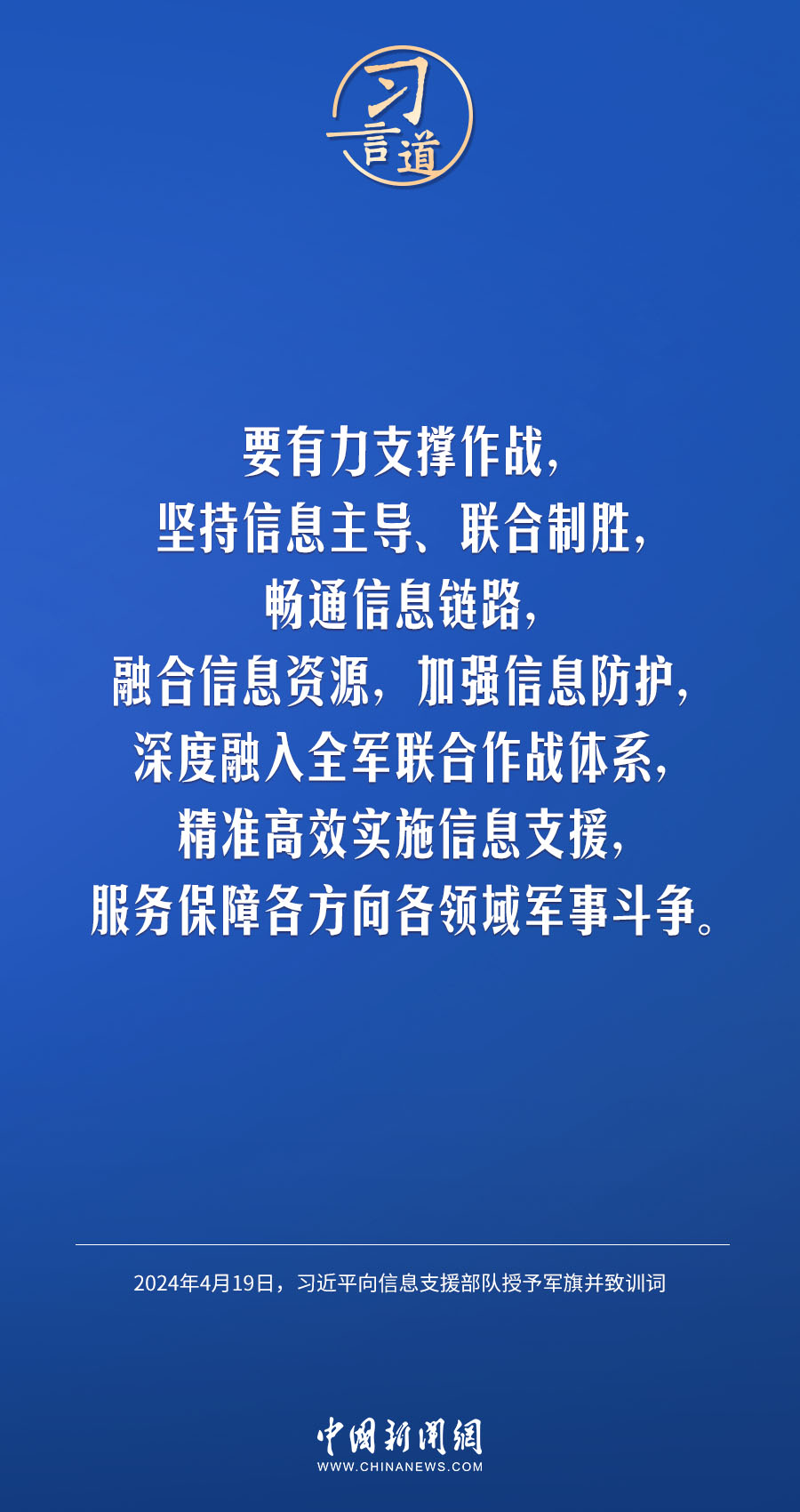中國人民解放軍信息支援部隊成立大會19日在北京八一大樓隆重舉行。中共中央總書記、國家主席、中央軍委主席習(xí)近平向信息支援部隊授予軍旗并致訓(xùn)詞,代表黨中央和中央軍委向信息支援部隊全體官兵致以熱烈祝賀。他強(qiáng)調(diào)——