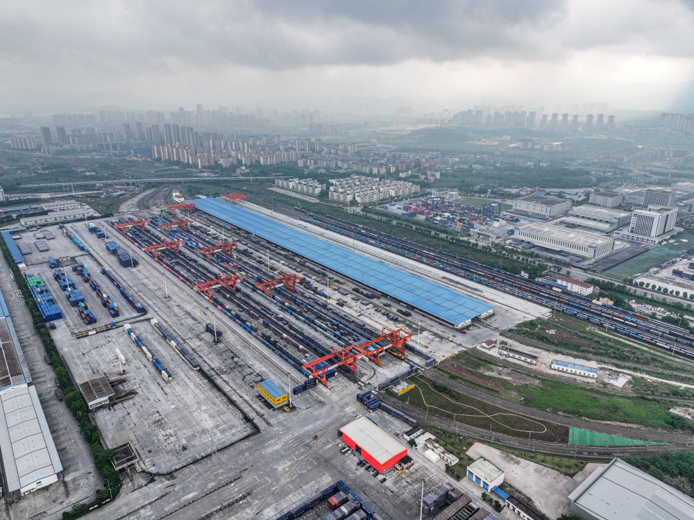 2022年6月23日,中歐班列(重慶)第10000列列車在重慶團(tuán)結(jié)村中心站等待發(fā)車,即將奔赴德國杜伊斯堡(無人機(jī)照片)。