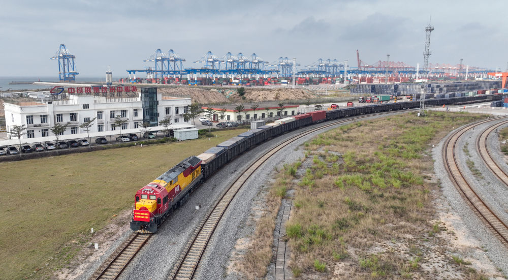 2023年1月22日,一趟西部陸海新通道鐵海聯(lián)運(yùn)班列從重慶團(tuán)結(jié)村中心站發(fā)車(無人機(jī)照片)。班列滿載著汽車、摩托車、發(fā)動(dòng)機(jī)和純堿等共計(jì)100個(gè)集裝箱的貨物,將經(jīng)廣西欽州港換乘海船去往印度尼西亞、菲律賓、喀麥隆、澳大利亞等國家和地區(qū)。