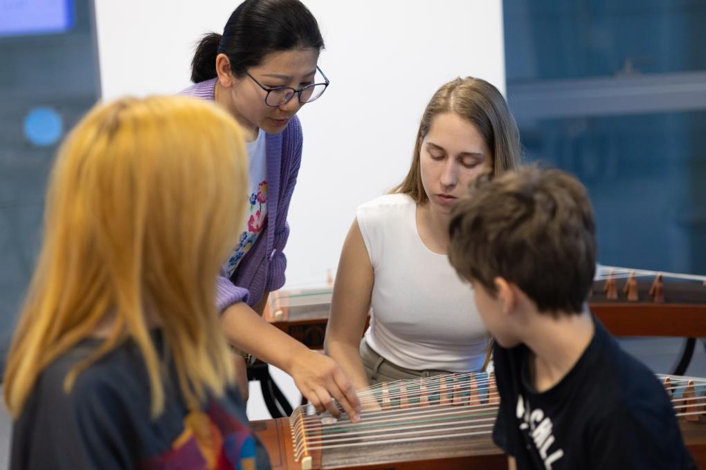 2024年4月29日,在塞爾維亞貝爾格萊德中國(guó)文化中心,古箏指導(dǎo)老師王宣(后左)在教學(xué)。新華社記者李京攝