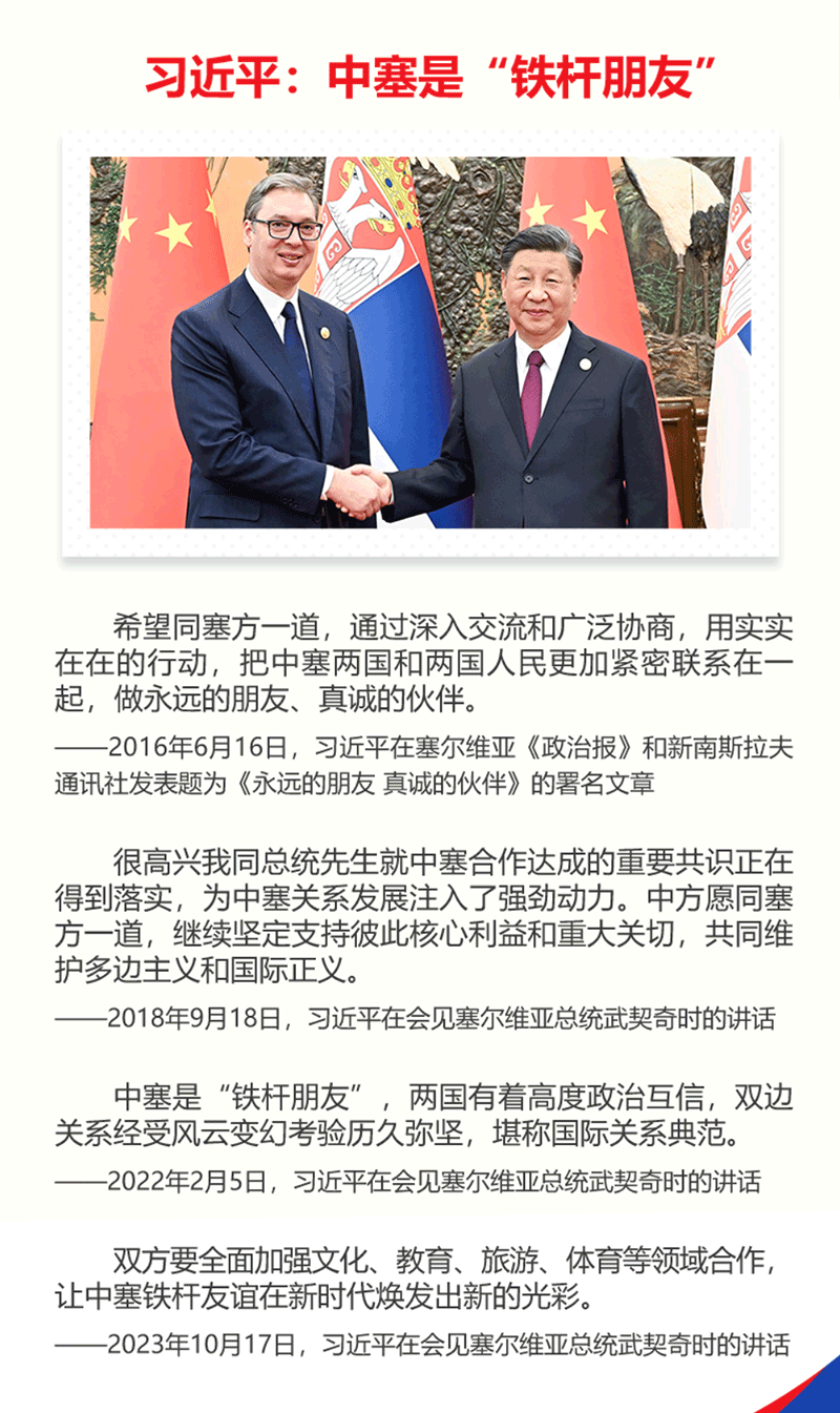 這是時隔近八年,習(xí)主席再次對塞爾維亞進(jìn)行國事訪問。中塞是“鐵桿朋友”,習(xí)主席指出,希望同塞方一道,通過深入交流和廣泛協(xié)商,用實實在在的行動,把中塞兩國和兩國人民更加緊密聯(lián)系在一起,做永遠(yuǎn)的朋友、真誠的伙伴。
