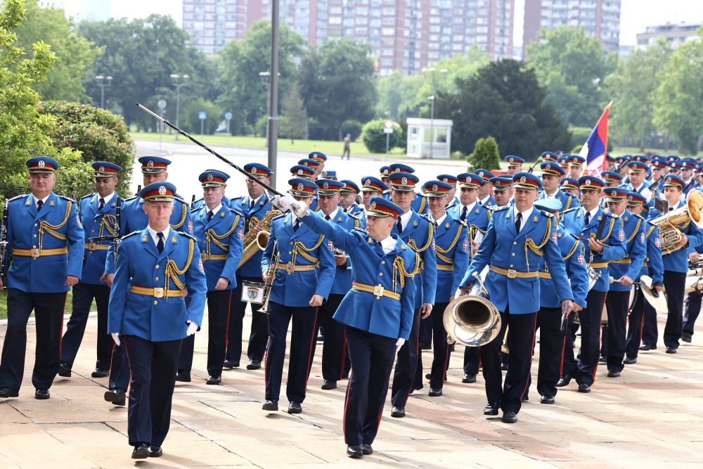 塞爾維亞大廈前,中塞兩國(guó)國(guó)旗迎風(fēng)飄揚(yáng),儀仗隊(duì)威武雄壯。