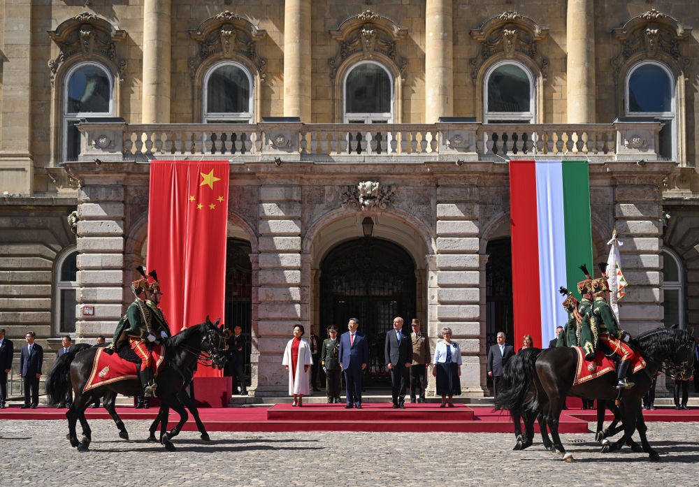 當地時間5月9日上午,國家主席習近平在布達佩斯出席匈牙利總統(tǒng)舒尤克和總理歐爾班共同舉行的隆重歡迎儀式。習近平在舒尤克陪同下檢閱國防軍儀仗隊和騎兵儀仗隊。