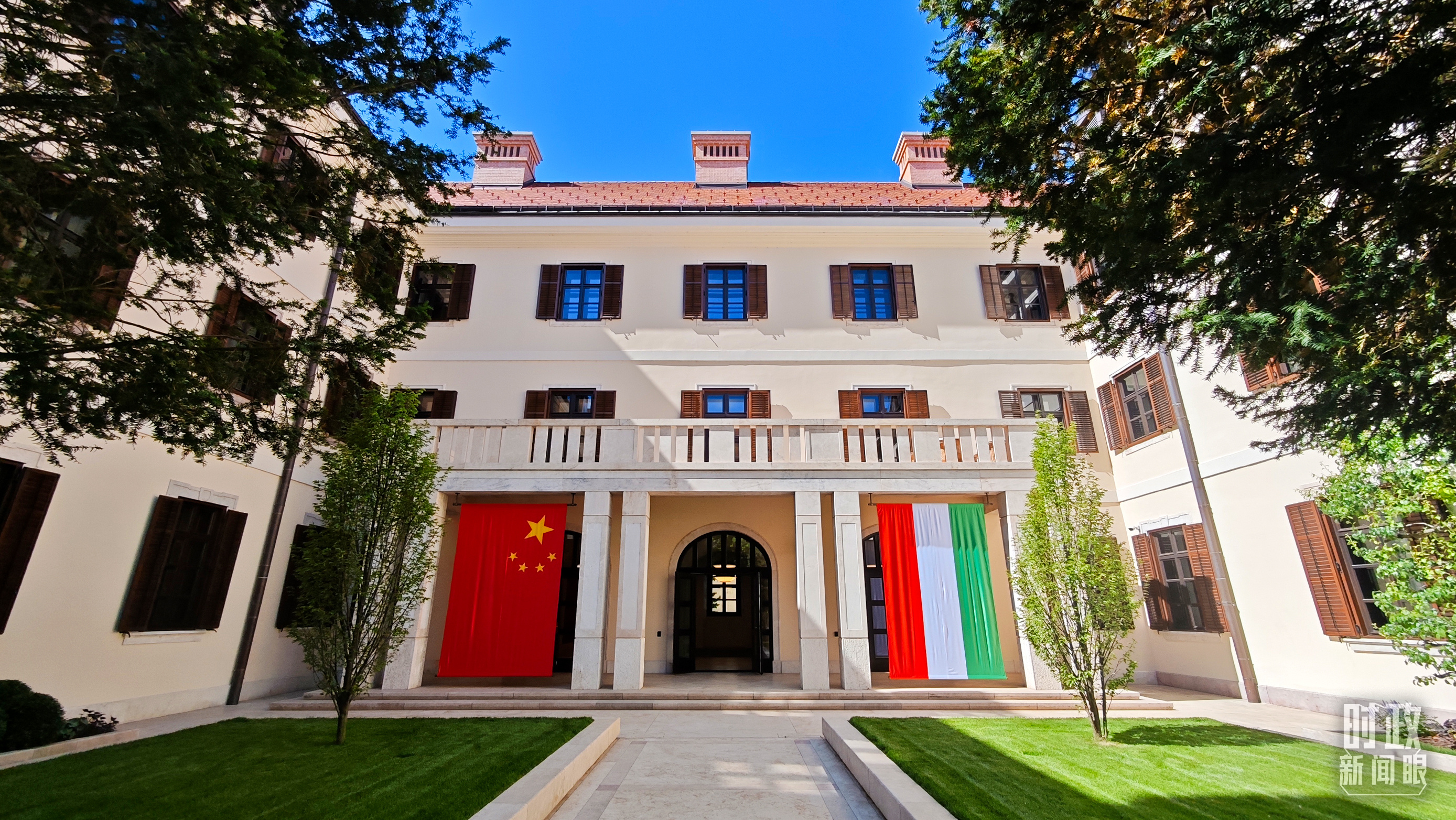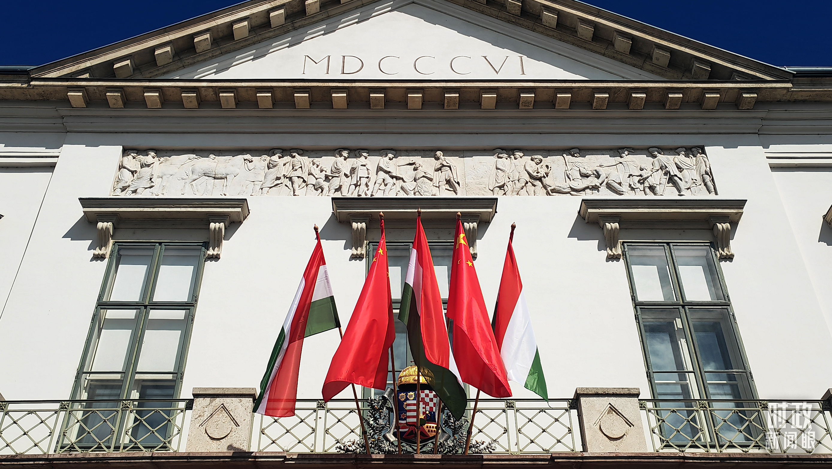 匈牙利總統(tǒng)府前懸掛的中匈兩國(guó)國(guó)旗。(總臺(tái)央視記者劉琦拍攝)