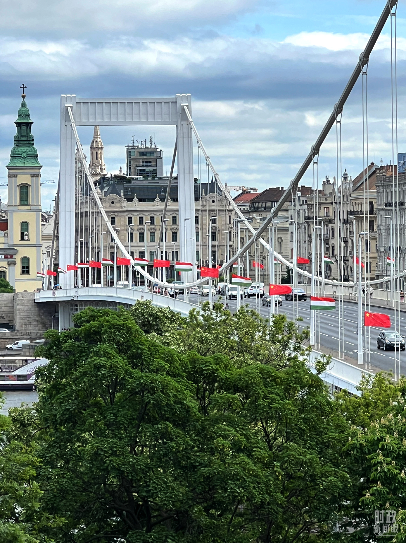 懸掛中匈兩國(guó)國(guó)旗的布達(dá)佩斯伊麗莎白大橋。(總臺(tái)央視記者石偉明拍攝)