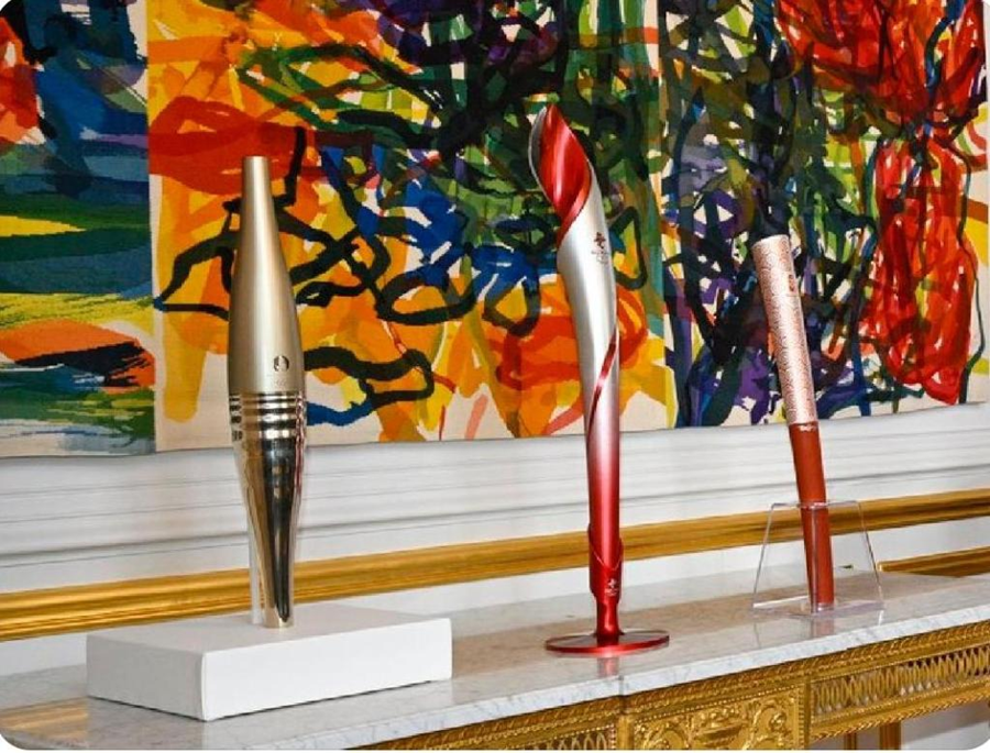 在法國愛麗舍宮一層肖像廳,三支奧運(yùn)火炬并排而立,格外引人注目。這是中法兩國元首夫婦互贈(zèng)禮品之一。