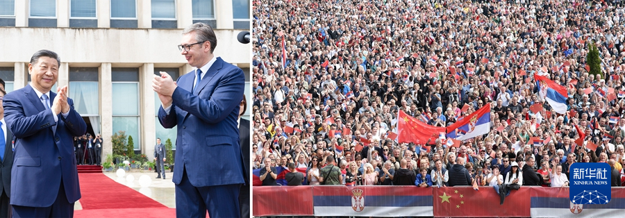 當(dāng)?shù)貢r(shí)間5月8日上午,國家主席習(xí)近平在貝爾格萊德塞爾維亞大廈同塞爾維亞總統(tǒng)武契奇舉行會(huì)談。會(huì)談前,武契奇陪同習(xí)近平來到政府大廈平臺(tái)(左圖)。大廈廣場上,一萬五千名塞爾維亞民眾揮舞中塞兩國國旗,對習(xí)近平表示最熱烈的歡迎(右圖)。(拼版照片) 新華社記者 黃敬文 丁海濤 攝