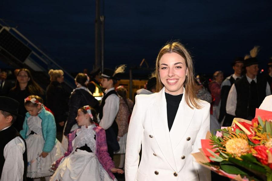 當(dāng)?shù)貢r(shí)間5月8日晚,在匈牙利布達(dá)佩斯國際機(jī)場歡迎隊(duì)伍中的匈牙利姑娘歐拉·塔瑪拉。新華社記者 謝環(huán)馳 攝