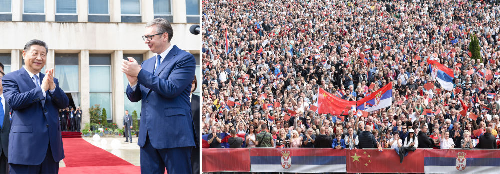 在塞爾維亞,武契奇總統(tǒng)率眾多政要赴機(jī)場(chǎng)迎接習(xí)近平主席。近2萬(wàn)名塞爾維亞民眾齊聚塞爾維亞大廈廣場(chǎng),揮舞中塞兩國(guó)國(guó)旗,熱情高呼“中國(guó)”的場(chǎng)景,令人感動(dòng);