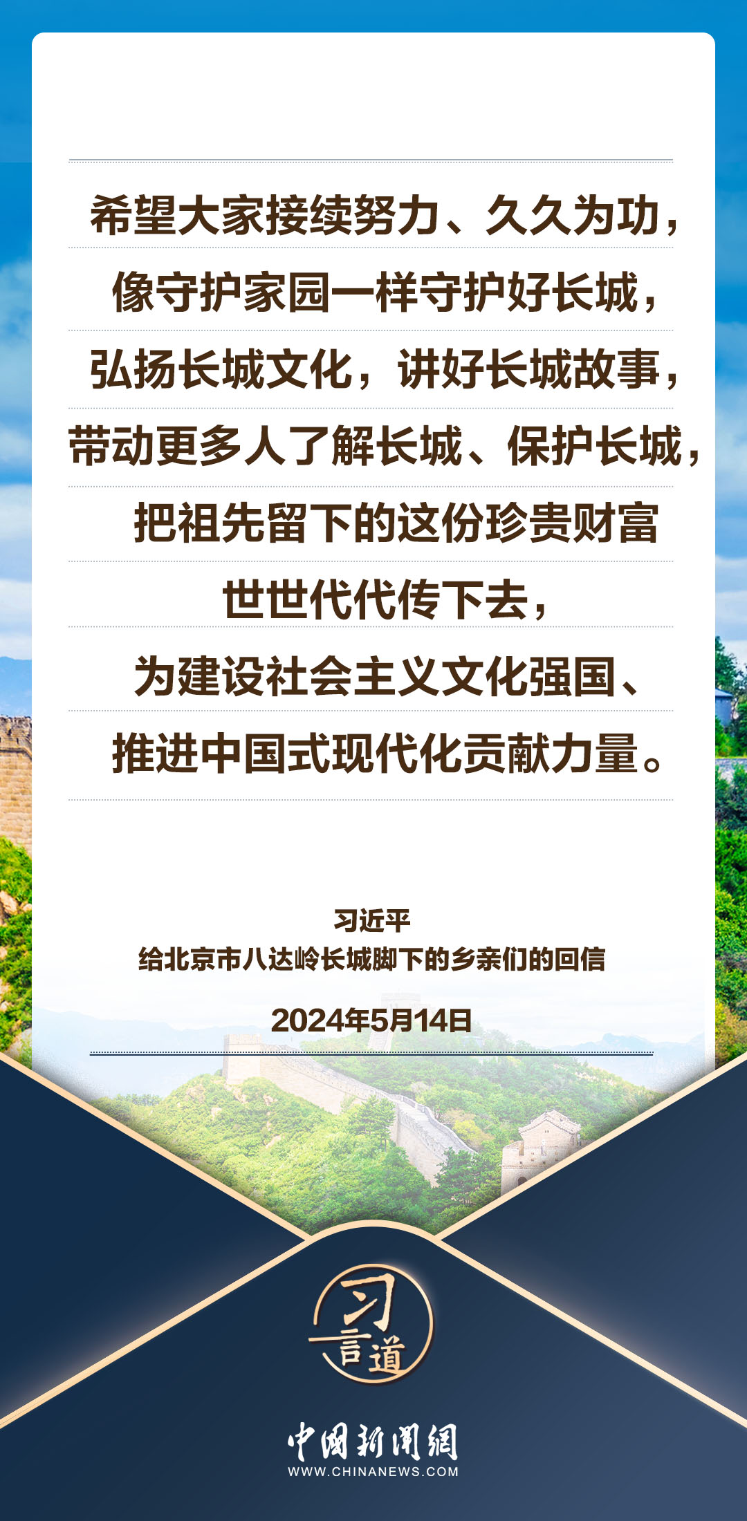 中共中央總書記、國家主席、中央軍委主席習(xí)近平5月14日給北京市延慶區(qū)八達嶺鎮(zhèn)石峽村的鄉(xiāng)親們回信,向他們致以誠摯問候并提出殷切期望。習(xí)近平指出——