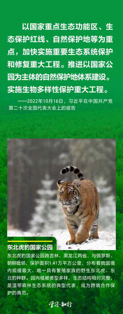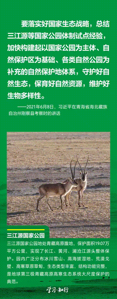“生物多樣性使地球充滿生機(jī),也是人類生存和發(fā)展的基礎(chǔ)。”推進(jìn)以國(guó)家公園為主體的自然保護(hù)地體系建設(shè),是習(xí)近平總書(shū)記作出的重要部署。三江源、大熊貓、東北虎豹、海南熱帶雨林、武夷山等首批國(guó)家公園正式設(shè)立以來(lái),生態(tài)功能持續(xù)向好,對(duì)保護(hù)生物多樣性、推進(jìn)人與自然和諧共生的現(xiàn)代化具有重要意義。