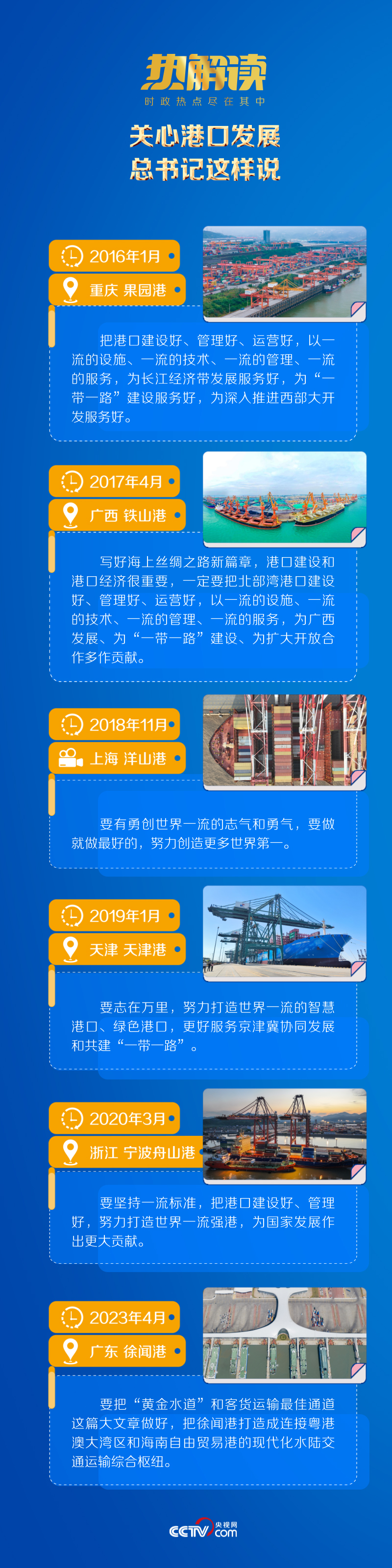從內(nèi)河航運的黃金水道到國際航運的港通四海,總書記多次在考察行程中關(guān)注我國沿海沿江港口建設,精心謀劃推進世界一流強港建設工作。