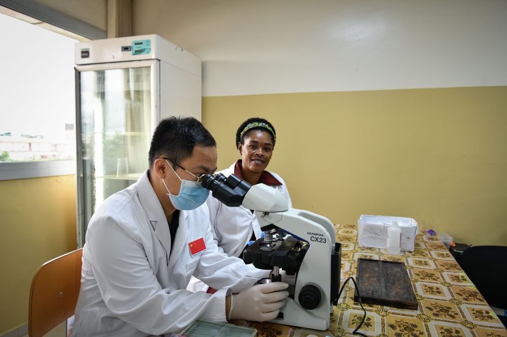 5月16日,在赤道幾內(nèi)亞馬拉博地區(qū)醫(yī)院,中國醫(yī)生同當(dāng)?shù)赝乱黄饳z測樣本。