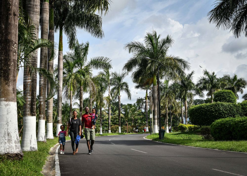 5月19日,在赤道幾內(nèi)亞首都馬拉博,當(dāng)?shù)鼐用裨谥袊髽I(yè)承建的馬拉博國家公園里散步。