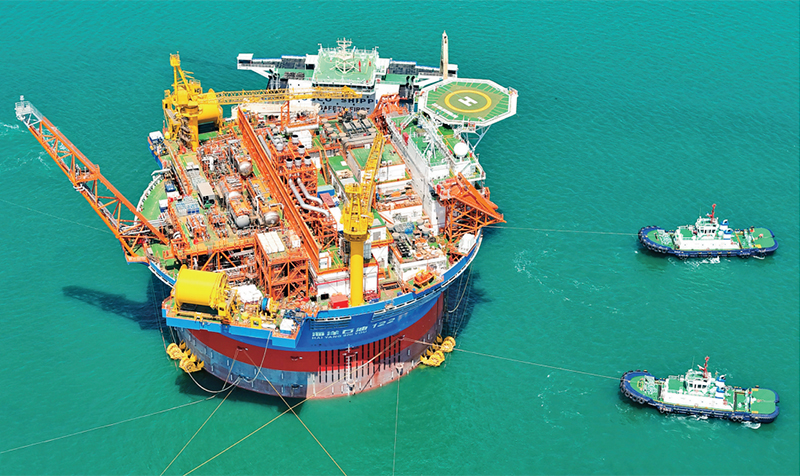 “??惶枴保莵喼奘姿覉A筒型浮式生產(chǎn)儲卸油裝置。該裝置集原油生產(chǎn)、存儲、外輸?shù)裙δ苡谝惑w,被網(wǎng)友們昵稱為“超級能源碗”,也是完全由我國自主設(shè)計建造的海上油氣加工廠。圖為2024年5月12日,“海葵一號”從中國海油青島國際化高端裝備制造基地離港啟運。 人民圖片 張進剛/攝