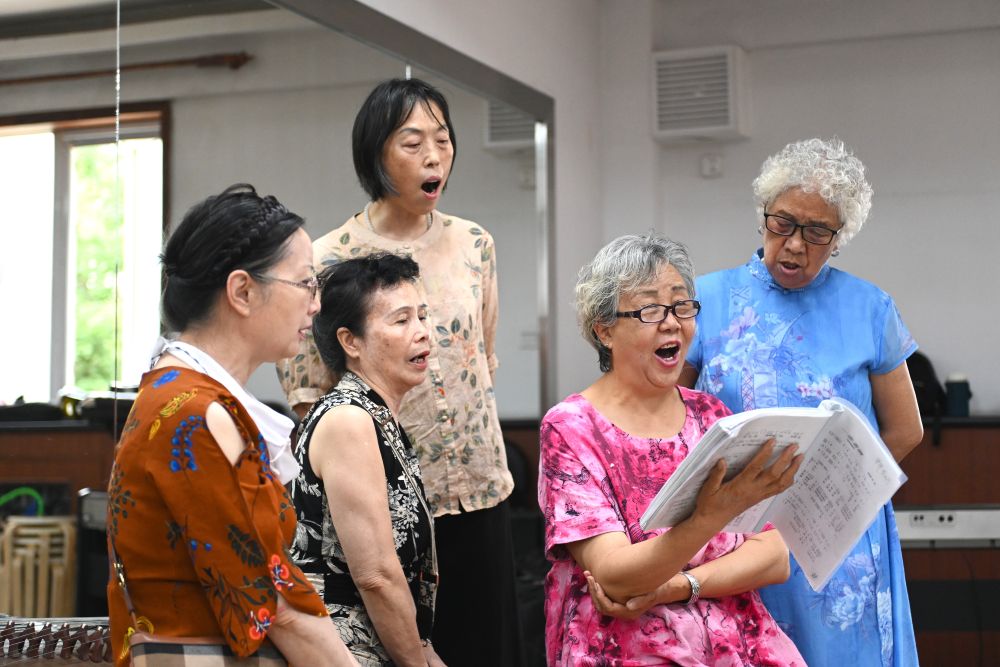 6月20日,長(zhǎng)城花園社區(qū)居民在活動(dòng)室排練節(jié)目。