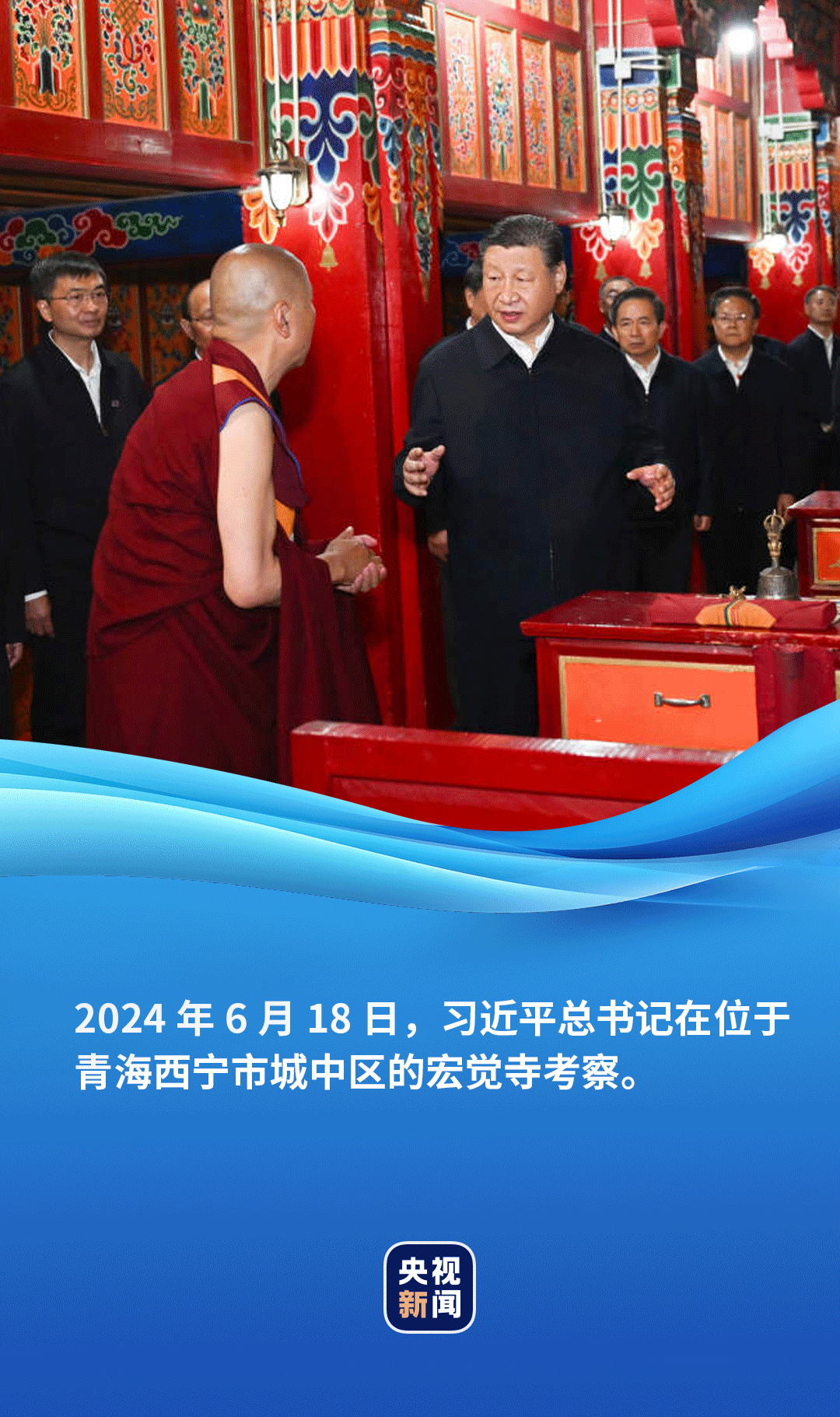 6月18日,正在青??疾斓牧?xí)近平總書記來到位于西寧市城中區(qū)的宏覺寺。在寺前院落,宏覺寺民主管理委員會負(fù)責(zé)人向總書記敬獻哈達,僧人提香爐、持寶傘迎接總書記。