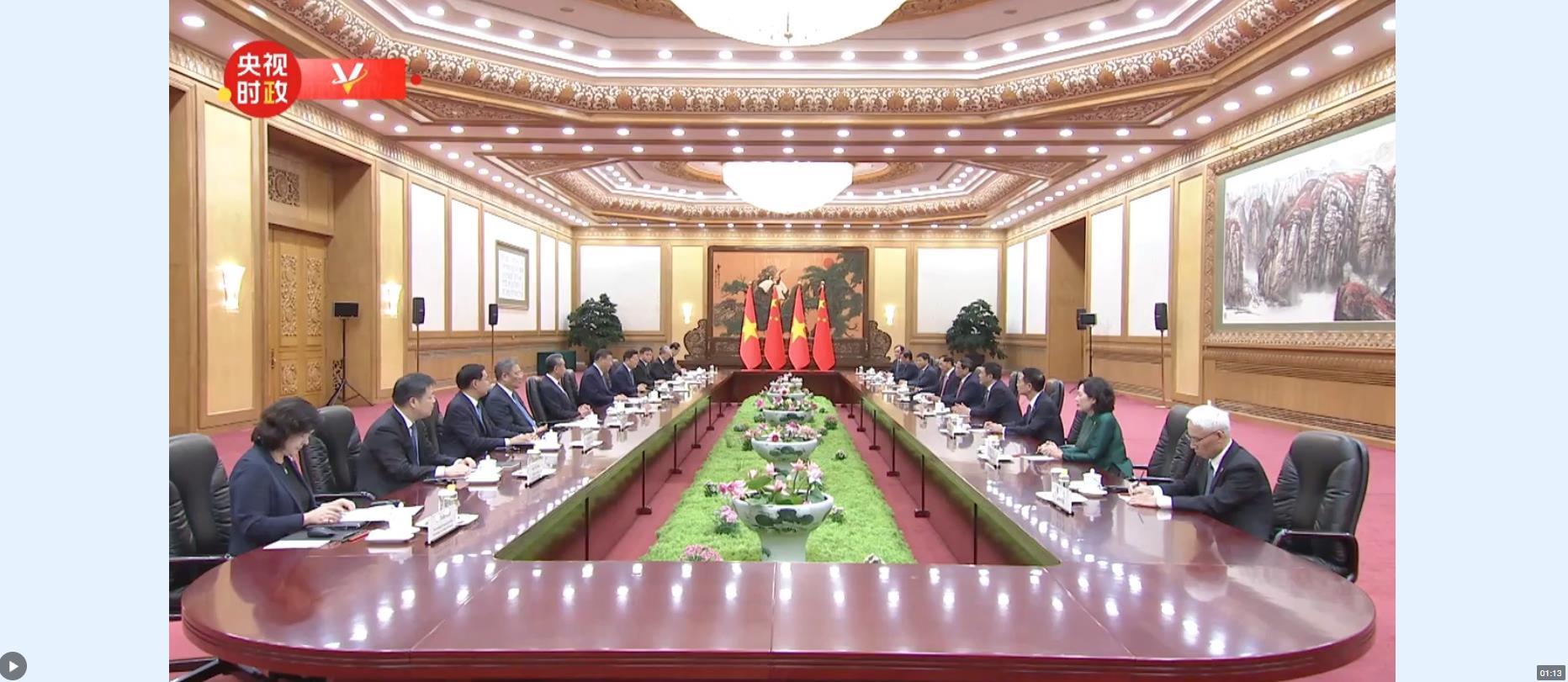 習(xí)近平指出,很高興再次與范明政總理會(huì)面。歡迎你來(lái)華出席夏季達(dá)沃斯論壇。去年年底我訪問(wèn)越南期間,同阮富仲總書記一道宣布構(gòu)建具有戰(zhàn)略意義的中越命運(yùn)共同體,引領(lǐng)兩國(guó)關(guān)系進(jìn)入新階段。半年多來(lái),兩黨兩國(guó)高層交往密切,各領(lǐng)域合作進(jìn)展順利,中越命運(yùn)共同體建設(shè)開(kāi)局良好,給兩國(guó)人民帶來(lái)實(shí)實(shí)在在的利益,我們對(duì)此深感高興。