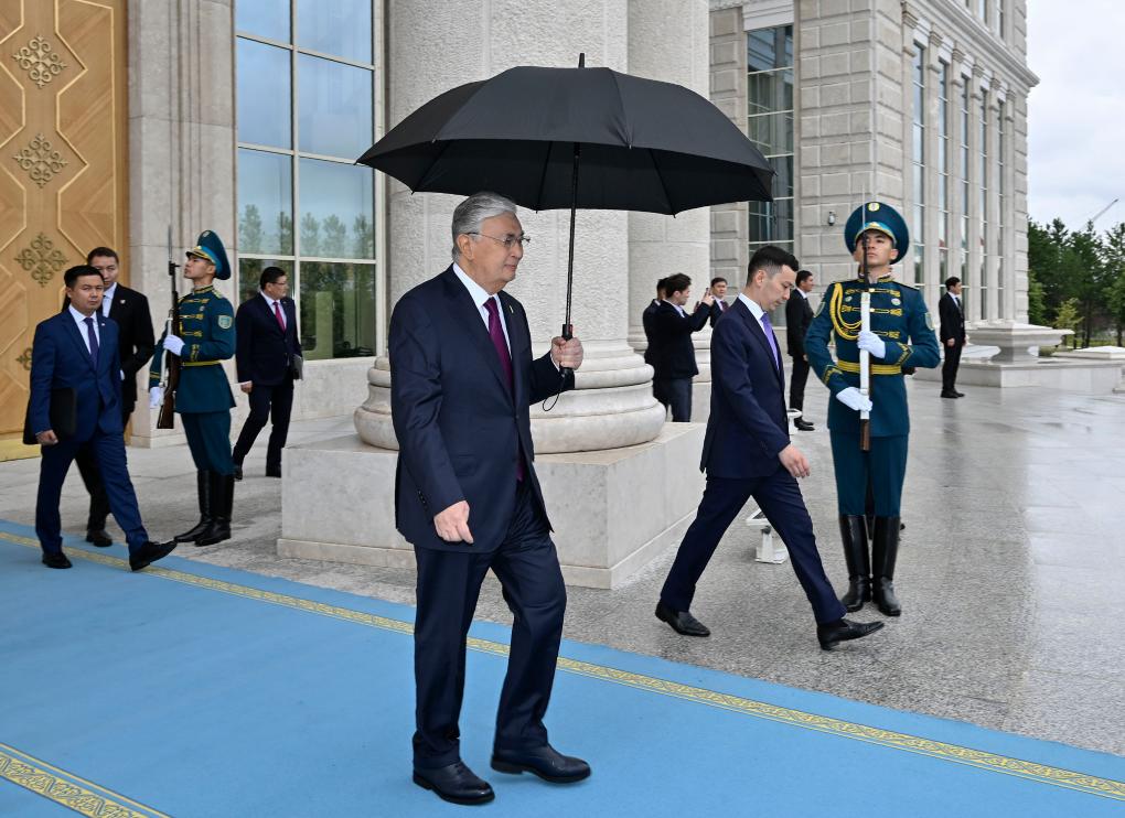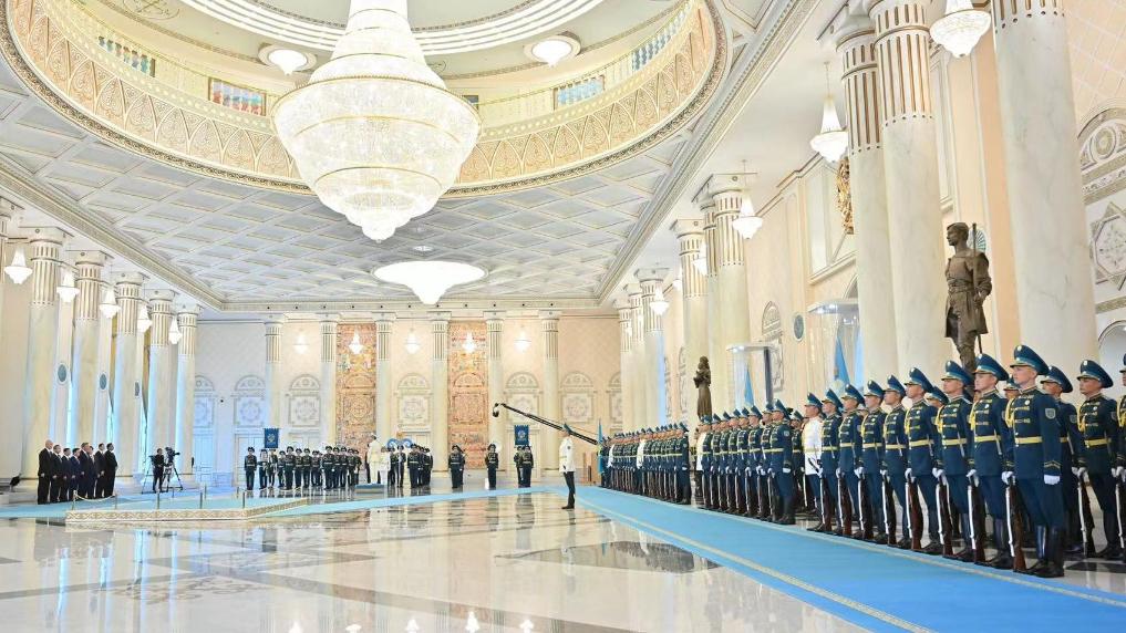 托卡耶夫為習近平舉行隆重歡迎儀式??偨y(tǒng)府大廳氣勢恢宏,禮兵威武挺拔。兩國元首分別同對方陪同人員一一握手致意。兩國元首登上檢閱臺,軍樂團奏中哈兩國國歌。習近平在托卡耶夫陪同下檢閱儀仗隊。