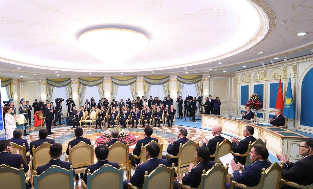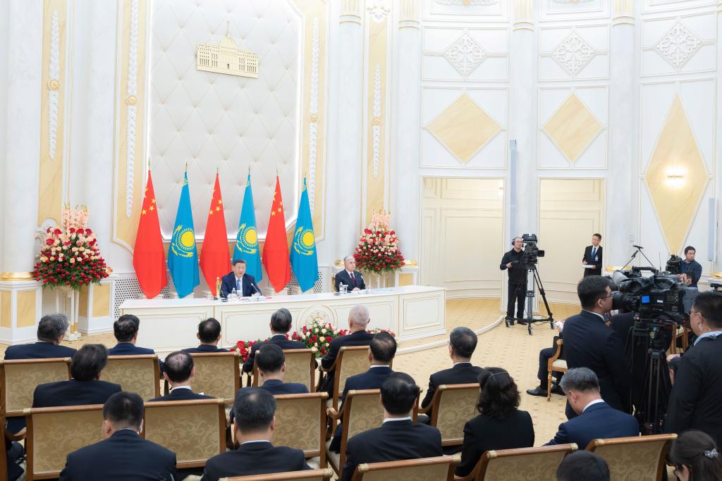 兩國元首共同簽署《中華人民共和國和哈薩克斯坦共和國聯(lián)合聲明》,并共同見證交換經(jīng)貿(mào)、互聯(lián)互通、航空航天、教育、媒體等領域數(shù)十項雙邊合作文件。