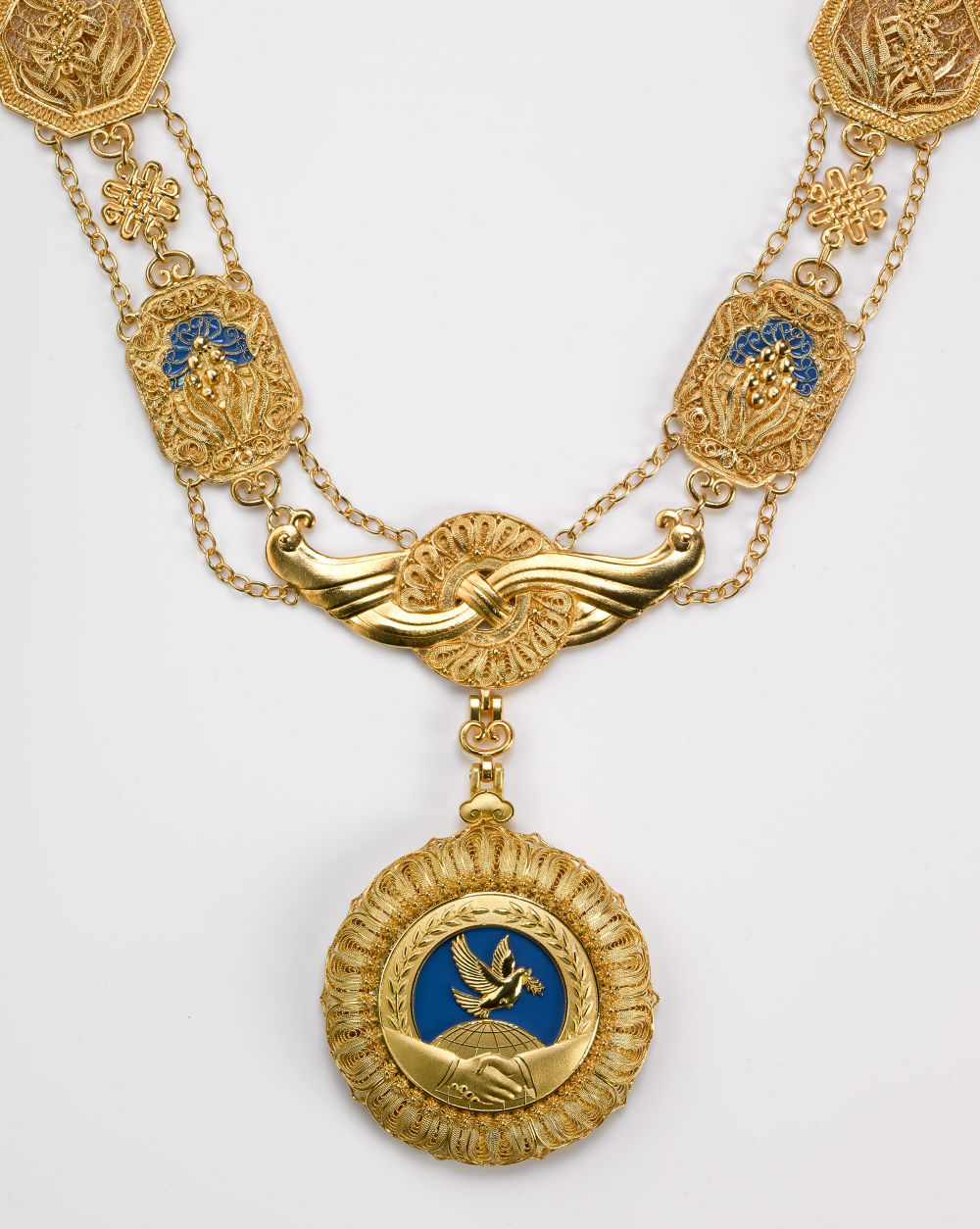 “友誼勛章”章體以金色、藍(lán)色為主色調(diào),采用和平鴿、地球、握手、荷花等元素,章鏈采用中國結(jié)、萬年青、牡丹花、玉璧、蘭草等元素,整體采用花絲鑲嵌、掐絲琺瑯等傳統(tǒng)工藝手工制作。設(shè)計(jì)制作象征中國人民同各國人民友好團(tuán)結(jié)、友誼長存,祝愿世界各國共同繁榮發(fā)展。