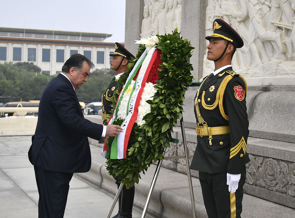 2017年8月31日,塔吉克斯坦總統(tǒng)拉赫蒙前往北京天安門廣場,向人民英雄紀(jì)念碑敬獻(xiàn)花圈。