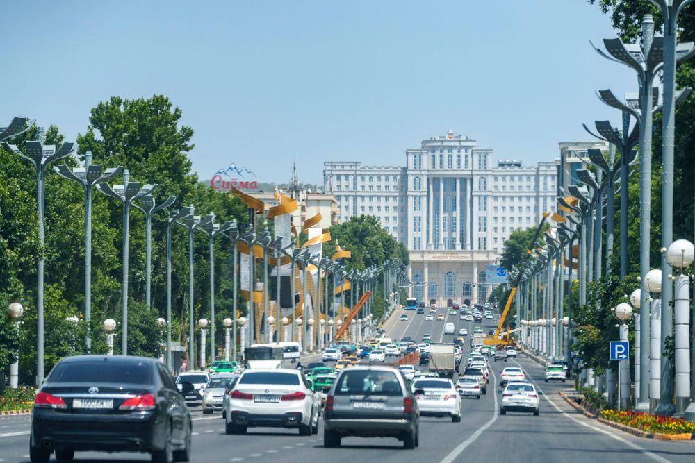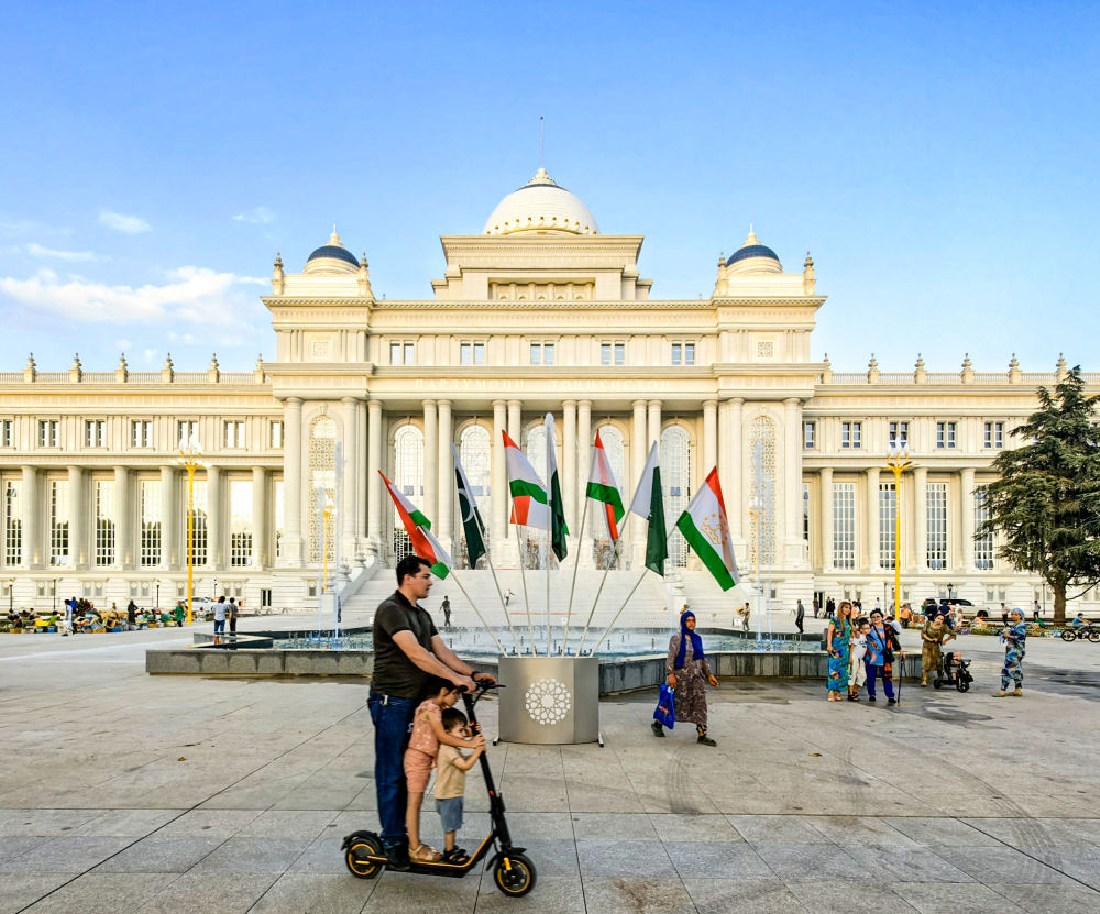 2024年7月1日,人們在塔吉克斯坦議會大樓前的廣場上休閑。