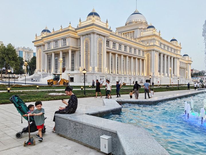 2024年6月29日,在塔吉克斯坦首都杜尚別,人們在塔吉克斯坦議會大樓前休閑。新華社記者 申宏 攝