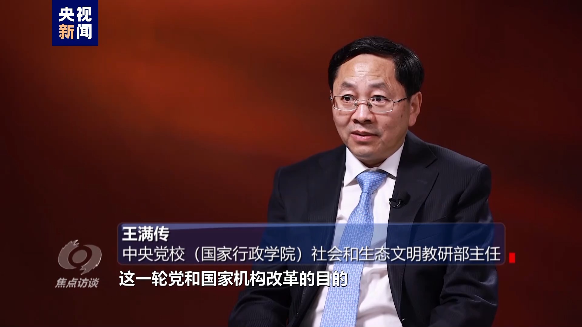中央黨校(國家行政學(xué)院)社會和生態(tài)文明教研部主任 王滿傳:通過這一系列重要的舉措,達(dá)到了習(xí)近平總書記提出的這一輪黨和國家機(jī)構(gòu)改革的目的。就是推動黨對社會主義現(xiàn)代化建設(shè)的領(lǐng)導(dǎo),在機(jī)構(gòu)設(shè)置上更加科學(xué)、在職能配置上更加優(yōu)化、在管理運(yùn)行上更加高效。