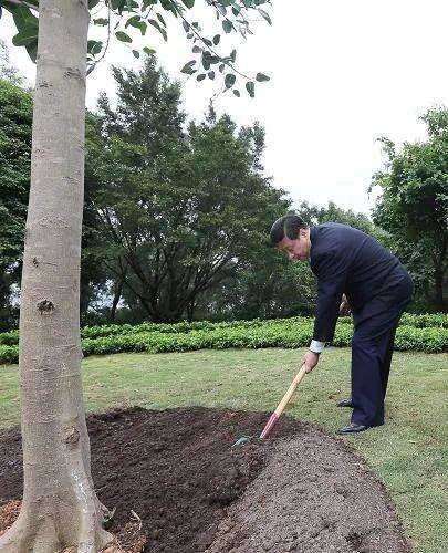 8年前種下的那棵高山榕已是亭亭如蓋、枝繁葉茂,展現(xiàn)出蓬勃的生命活力??倳涀叩綐湎?,深有感慨地說:“8年了,彈指一揮間啊。選的這個(gè)地方很好,樹冠能展開,樹長(zhǎng)得也快。”