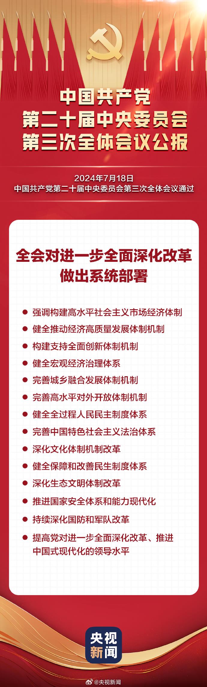 中國(guó)共產(chǎn)黨第二十屆中央委員會(huì)第三次全體會(huì)議于2024年7月15日至18日在北京舉行,全會(huì)對(duì)進(jìn)一步全面深化改革做出系統(tǒng)部署,強(qiáng)調(diào)構(gòu)建高水平社會(huì)主義市場(chǎng)經(jīng)濟(jì)體制,健全推動(dòng)經(jīng)濟(jì)高質(zhì)量發(fā)展體制機(jī)制,構(gòu)建支持全面創(chuàng)新體制機(jī)制,健全宏觀經(jīng)濟(jì)治理體系,完善城鄉(xiāng)融合發(fā)展體制機(jī)制,完善高水平對(duì)外開(kāi)放體制機(jī)制,健全全過(guò)程人民民主制度體系,完善中國(guó)特色社會(huì)主義法治體系,深化文化體制機(jī)制改革,健全保障和改善民生制度體系,深化生態(tài)文明體制改革,推進(jìn)國(guó)家安全體系和能力現(xiàn)代化,持續(xù)深化國(guó)防和軍隊(duì)改革,提高黨對(duì)進(jìn)一步全面深化改革、推進(jìn)中國(guó)式現(xiàn)代化的領(lǐng)導(dǎo)水平。