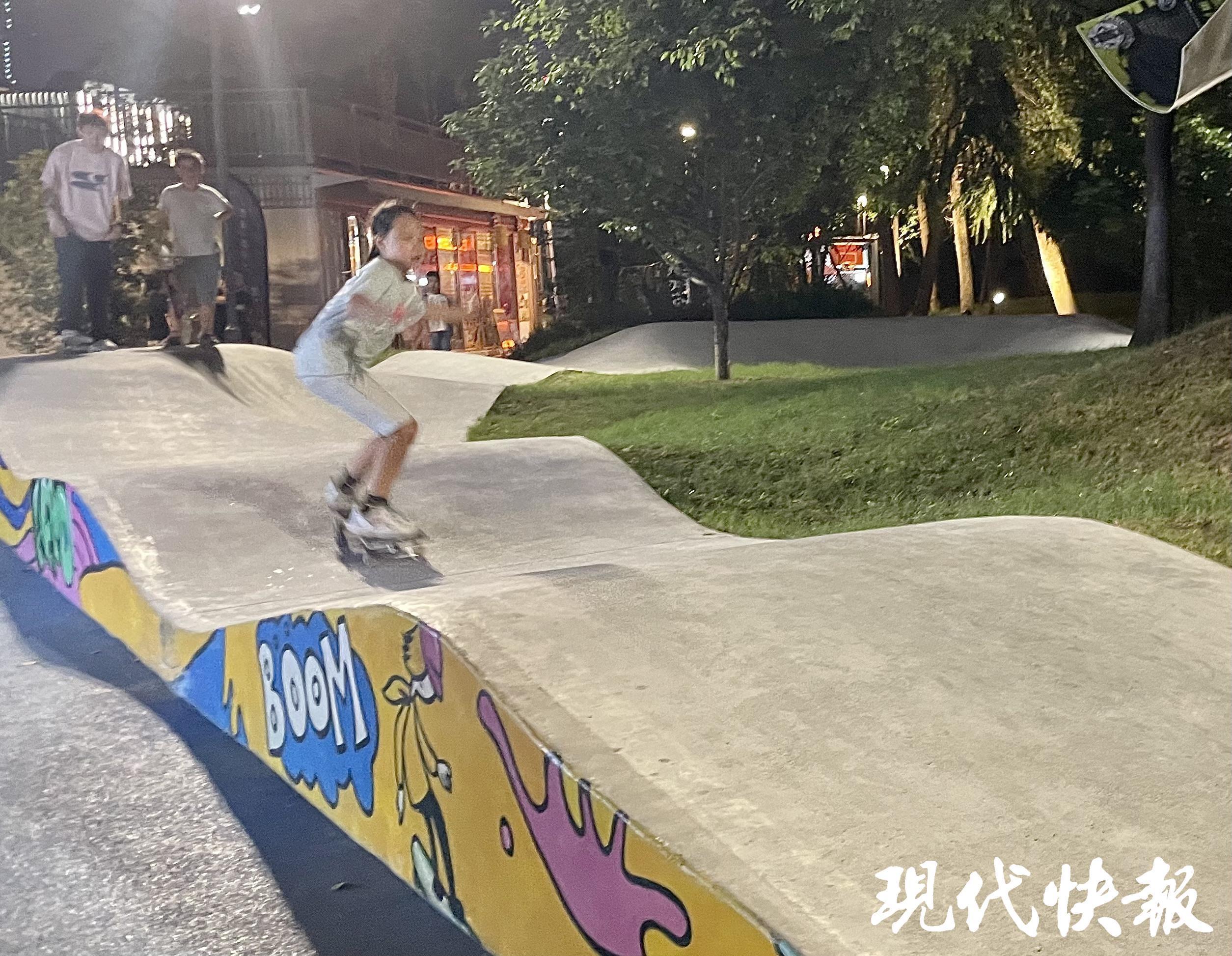 夜幕降臨,南京西城·夜未央的滑板場地上,一群青少年正在隨著起伏不定的坡道感受風(fēng)的速度。