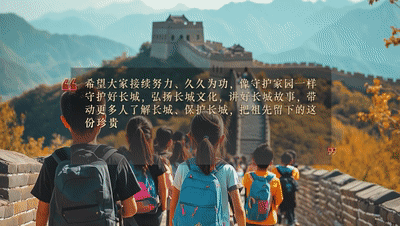希望大家接續(xù)努力、久久為功,像守護(hù)家園一樣守護(hù)好長(zhǎng)城,弘揚(yáng)長(zhǎng)城文化,講好長(zhǎng)城故事,帶動(dòng)更多人了解長(zhǎng)城、保護(hù)長(zhǎng)城,把祖先留下的這份珍貴財(cái)富世世代代傳下去,為建設(shè)社會(huì)主義文化強(qiáng)國(guó)、推進(jìn)中國(guó)式現(xiàn)代化貢獻(xiàn)力量。