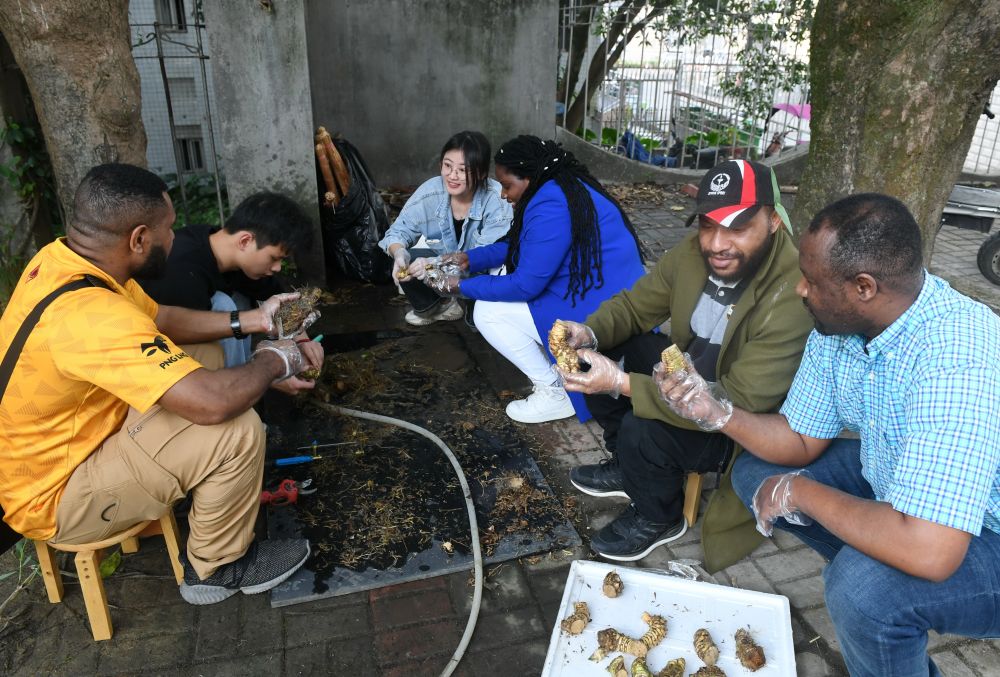 3月28日,在位于福州的福建農(nóng)林大學(xué),來自盧旺達和巴布亞新幾內(nèi)亞的學(xué)生與菌草專業(yè)學(xué)生交流。新華社記者 林善傳 攝