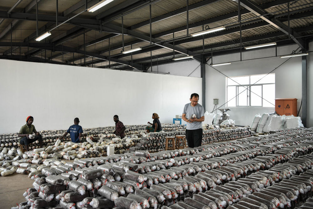 2024年8月13日,在盧旺達南方省胡耶區(qū)的中國援盧農(nóng)業(yè)技術(shù)示范中心,菌草專家陳曉斌(右)檢查菌袋。自菌草技術(shù)引入盧旺達以來,當?shù)鼐莓a(chǎn)業(yè)發(fā)展迅速,不僅為市場提供了豐富的食用菌產(chǎn)品,還創(chuàng)造了大量就業(yè)機會。