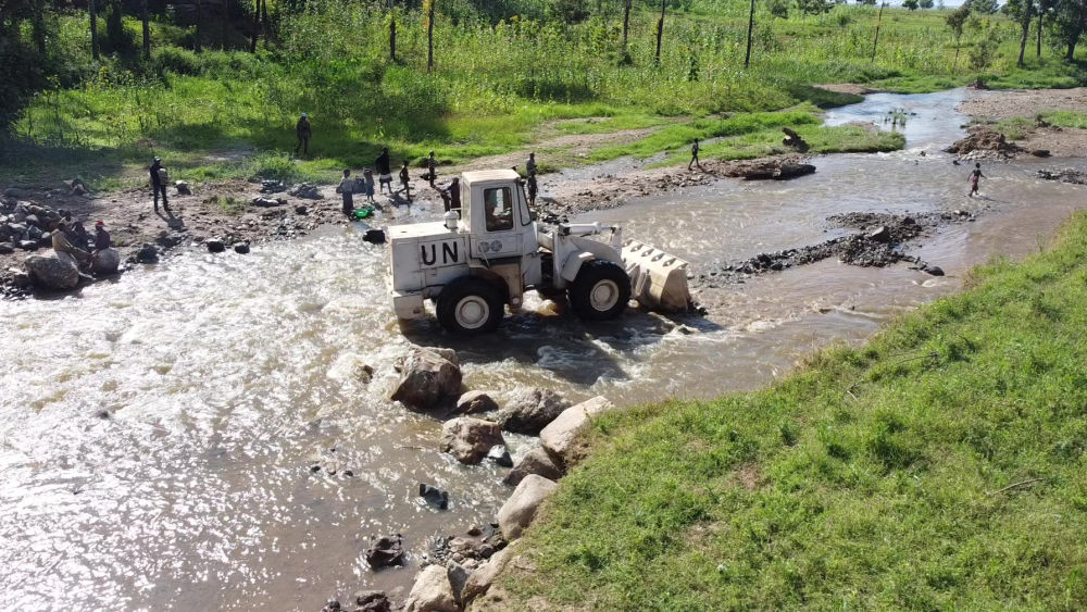 2023年6月7日,在剛果(金)南基伍省卡萊亥地區(qū),中國(guó)第26批赴剛果(金)維和工兵分隊(duì)官兵進(jìn)行施工作業(yè)。