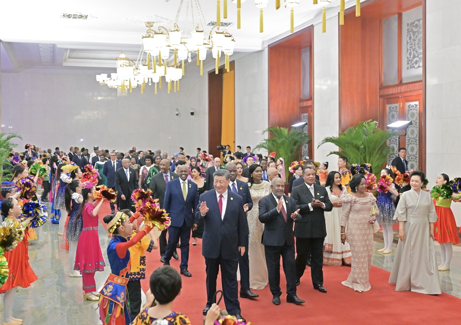 出席論壇峰會的51個非洲國家元首、政府首腦及配偶,2位總統(tǒng)代表,非盟委員會主席和聯(lián)合國秘書長等貴賓陸續(xù)抵達人民大會堂。習(xí)近平和彭麗媛熱情迎接,同他們分別握手問候,并集體合影留念。