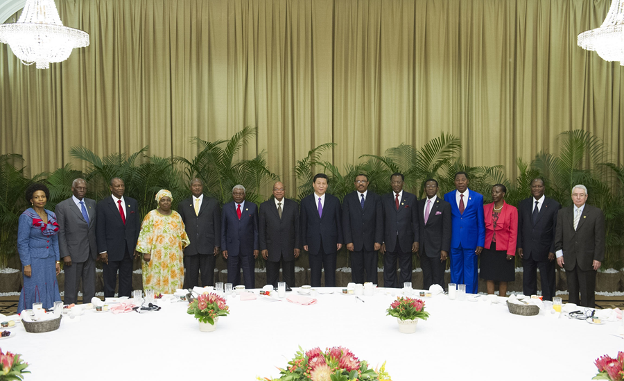 圖為2013年3月28日,國(guó)家主席習(xí)近平在南非德班同非洲國(guó)家領(lǐng)導(dǎo)人早餐會(huì)合影。新華社發(fā)