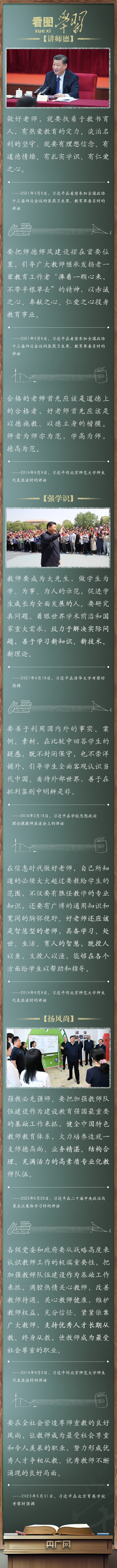 教育大計,教師為本。黨的十八大以來,以習(xí)近平同志為核心的黨中央堅持把教育擺在優(yōu)先發(fā)展的戰(zhàn)略位置,推動新時代教育事業(yè)取得歷史性成就、發(fā)生格局性變化。習(xí)近平總書記緊扣“培養(yǎng)什么人、怎樣培養(yǎng)人、為誰培養(yǎng)人”這一教育的根本問題,對建設(shè)新時代高素質(zhì)專業(yè)化教師隊伍作出一系列重要指示,激勵廣大教師立德修身、敬業(yè)立學(xué),強(qiáng)調(diào)要在全黨全社會弘揚(yáng)尊師重教的社會風(fēng)尚。在第四十個教師節(jié)到來之際,讓我們一起牢記并踐行總書記的殷殷囑托!