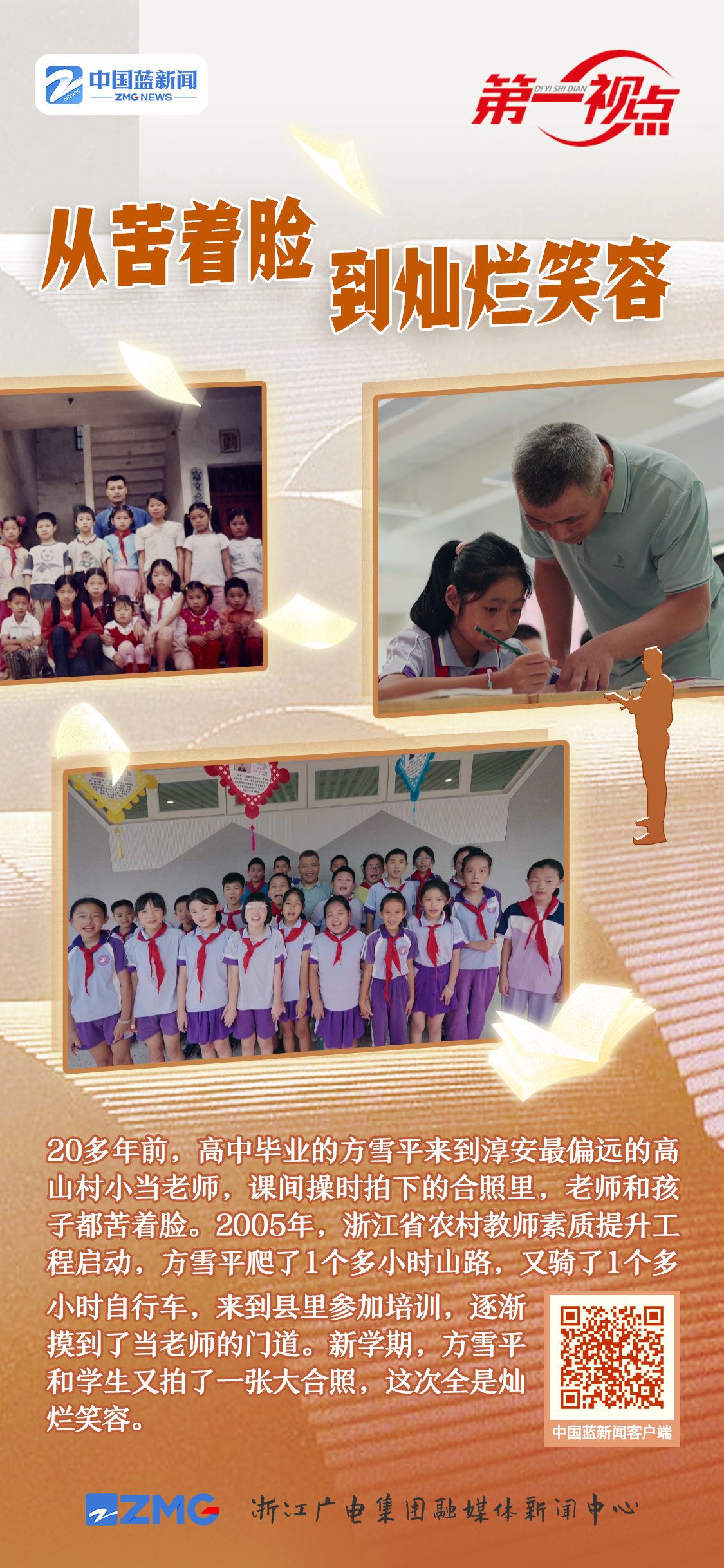 彼時的浙江,小學教師的學歷達標率,在全國排位倒數(shù)。高中畢業(yè)的農(nóng)村老師方雪平,來到淳安最偏遠的高山村小。一個人,要教兩個年級20多個孩子的全部科目。一次課間操時,村小老師拍下的照片,無論是老師還是孩子,一個個都苦著臉。方雪平說:“當時(上課時)我心里是很緊張的,緊張到手心冒汗。外出培訓的機會幾乎是沒有的,自己慢慢去摸索唄?!?/p>