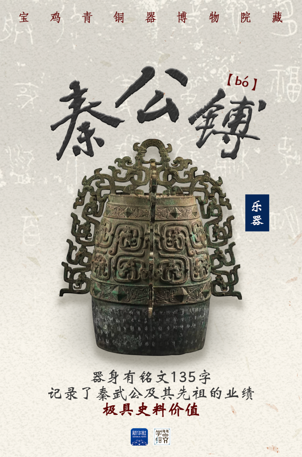 這件秦公镈是大型打擊樂器,器身有135字銘文,記述了秦襄公被周平王“賞宅受國”的歷史,以及文公、靜公、憲公三代治國興邦的業(yè)績(jī),是研究秦國早期歷史的重要實(shí)物資料。