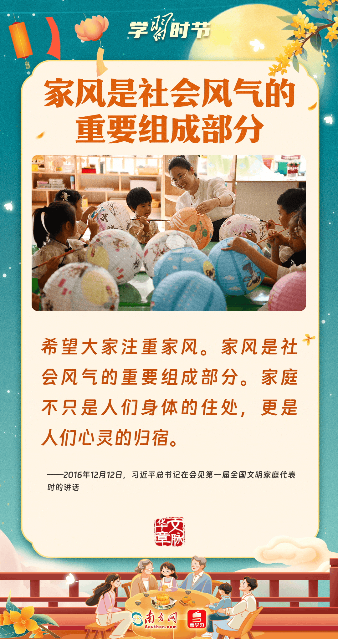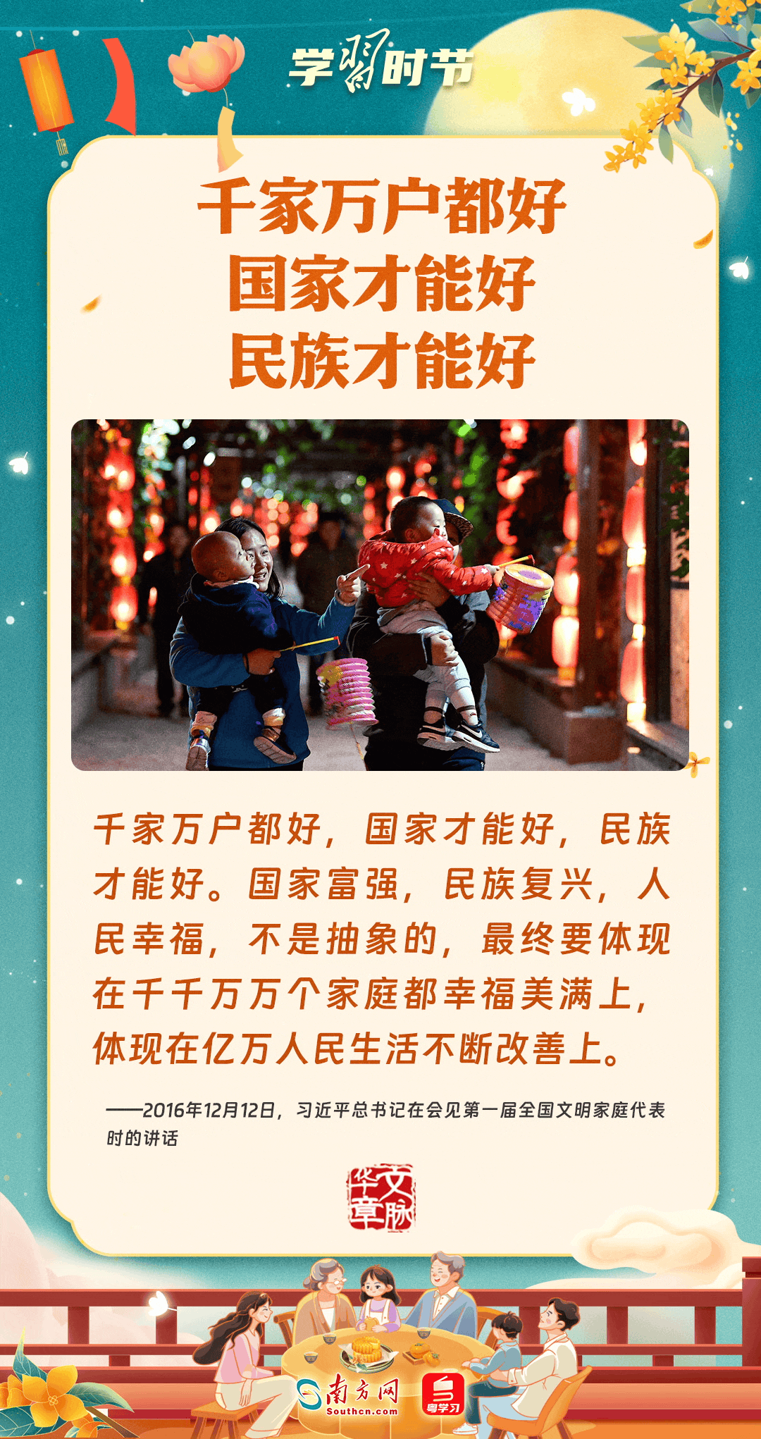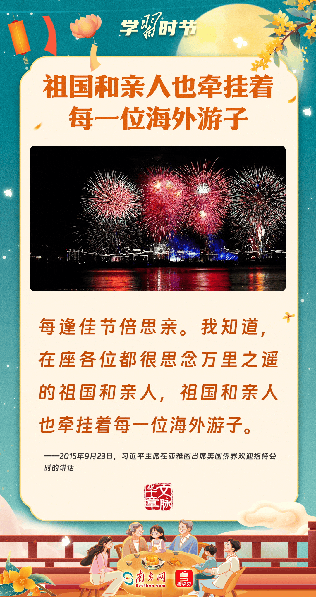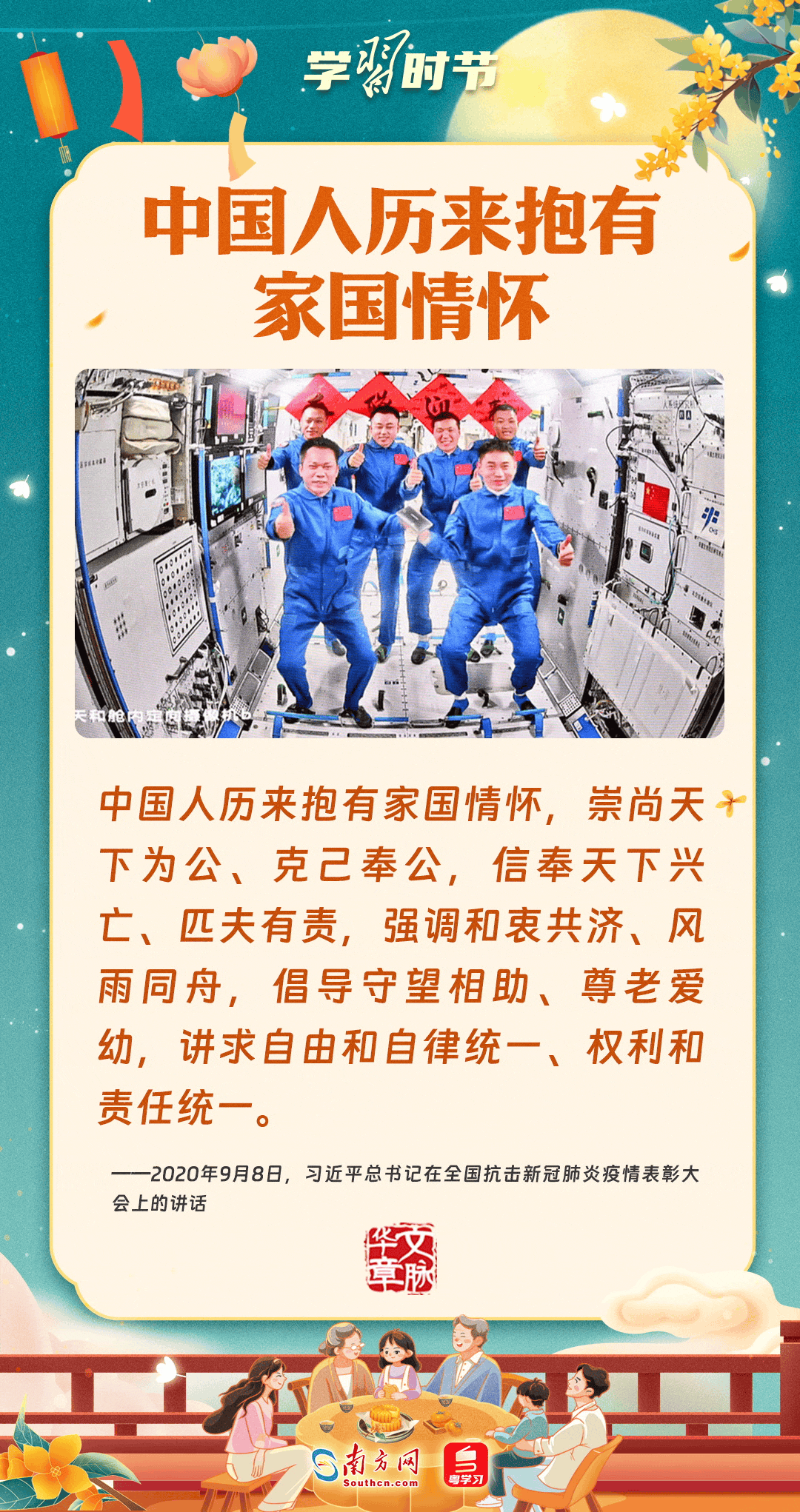 明月寄相思,家國總關(guān)情。作為中華優(yōu)秀傳統(tǒng)文化的重要載體之一,中秋節(jié)不但寄托著海內(nèi)外華人對闔家團圓的美好期許,還承載著深厚的故鄉(xiāng)情、家國情。習近平總書記曾在多個場合深刻闡述個人、家庭與國家之間的關(guān)系,強調(diào)要厚植家國情懷,把實現(xiàn)個人夢、家庭夢融入國家夢、民族夢之中。中秋佳節(jié),讓我們一起回顧總書記那些經(jīng)典話語,共同感受他至深至厚的家國情懷。