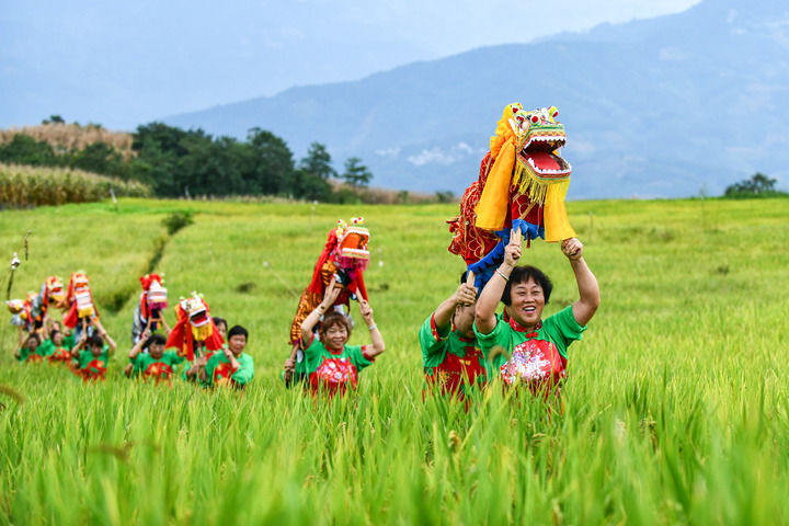 在云南省紅河哈尼族彝族自治州個舊市卡房鎮(zhèn)的旱地優(yōu)質稻種植示范區(qū),群眾抬著板凳龍在田間穿行迎接豐收季的到來(2024年9月20日攝)。新華社記者 王靜頤 攝