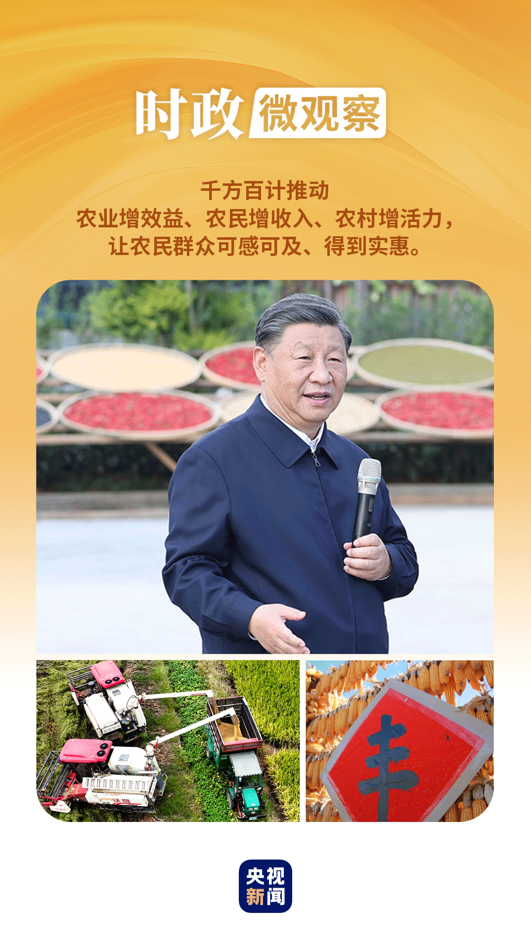 在第七個(gè)“中國農(nóng)民豐收節(jié)”到來之際,習(xí)近平總書記代表黨中央,向全國廣大農(nóng)民和工作在“三農(nóng)”戰(zhàn)線上的同志們致以節(jié)日祝賀和誠摯問候,對于堅(jiān)持不懈夯實(shí)農(nóng)業(yè)基礎(chǔ),推進(jìn)鄉(xiāng)村全面振興提出殷切期望和要求——